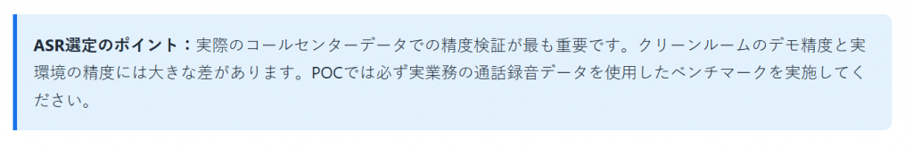 ASRは音声AIエージェントの入口となる技術です。認識精度が低いと、後段のすべての処理に影響します。