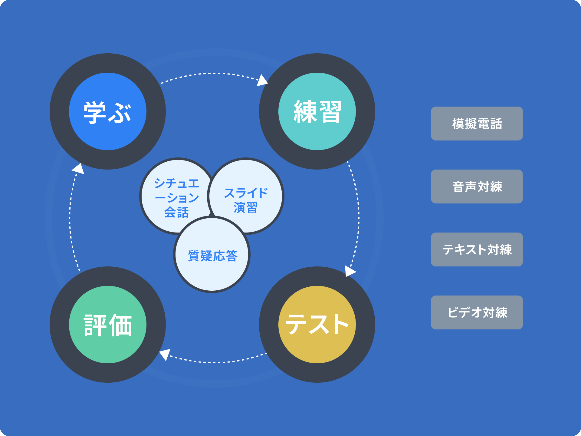 LLM、生成AI、TTS、自社開発のASR・NLP技術を基に、よりリアルなシナリオ、より正確な評価を実現し、使うほど賢くなる